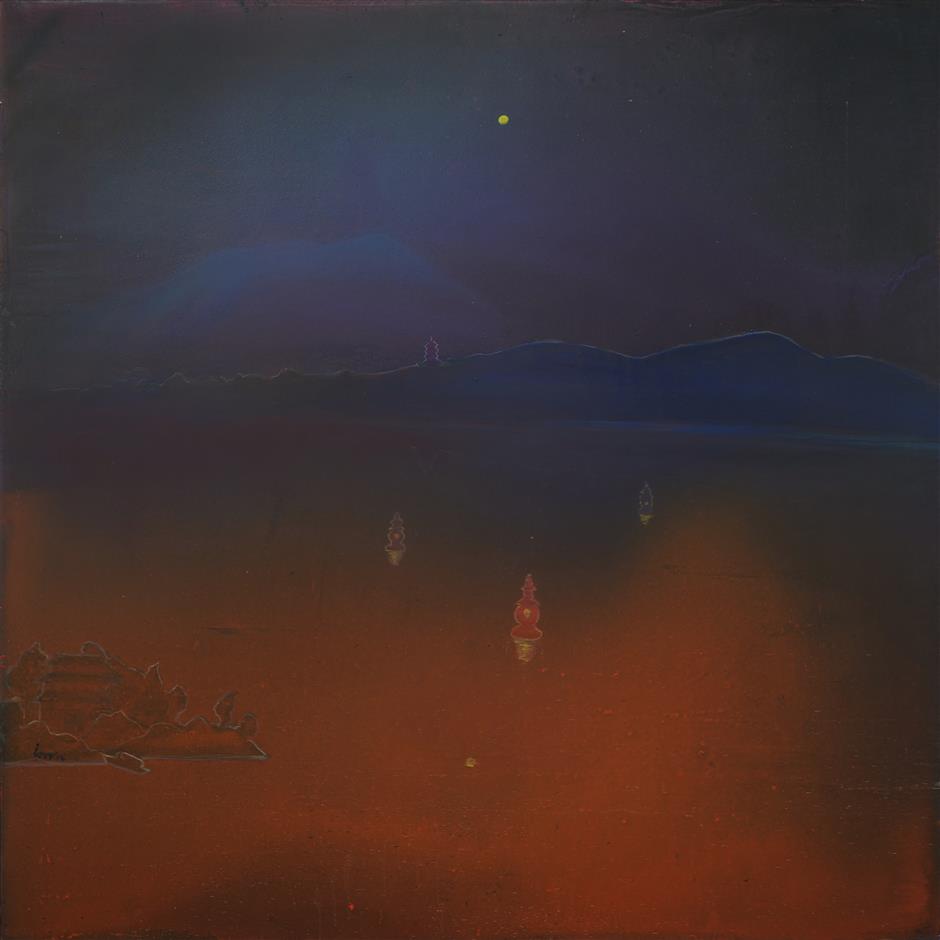 in the oil painting "three ponds mirroring the moon," zheng crafts a mystical landscape with a masterful gradient from earthy warmth to celestial coolness. minimalistic in detail, the painting's fiery orange base suggests a twilight glow, with enigmatic silhouettes adding mystery. above, the tranquil moon reigns over a vast landscape, its reflection only vaguely seen. zheng's smooth brushwork and subtle interplay of light create a dreamlike quality.